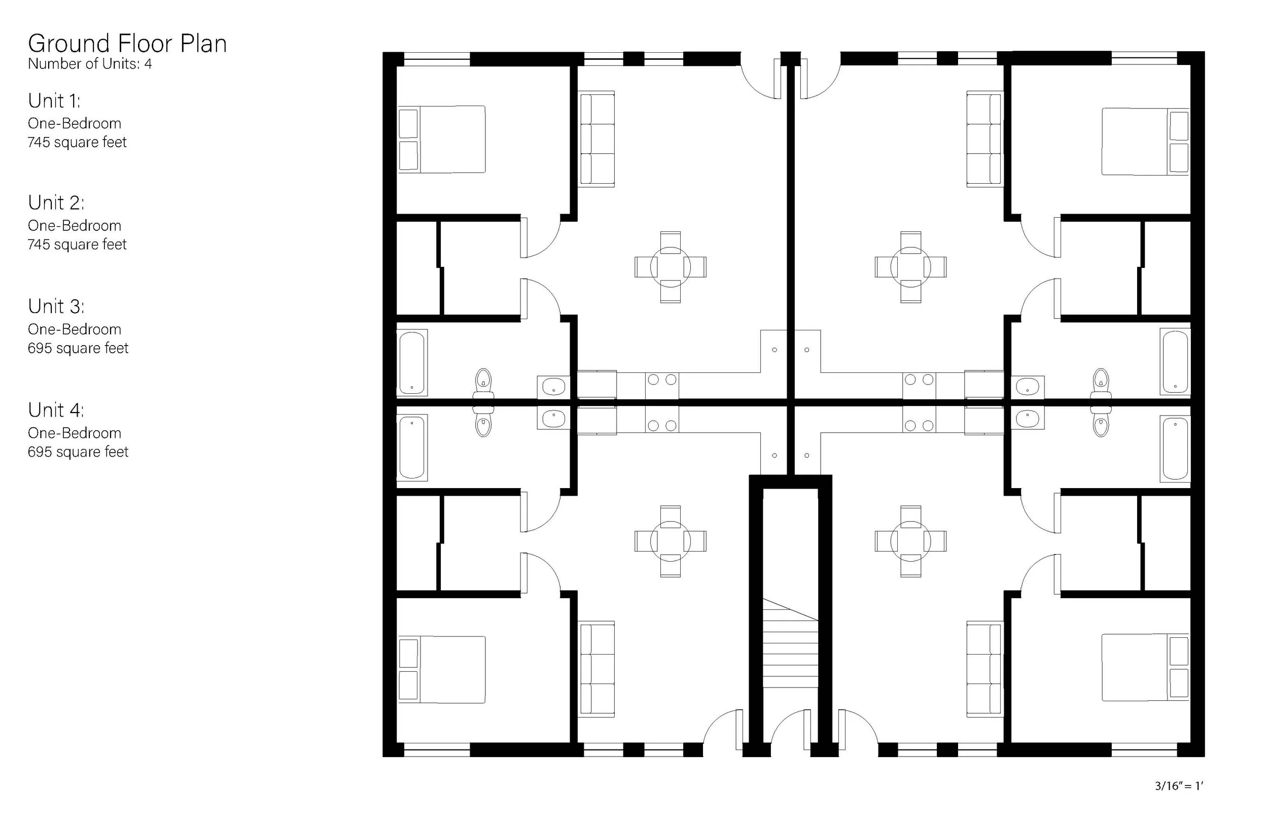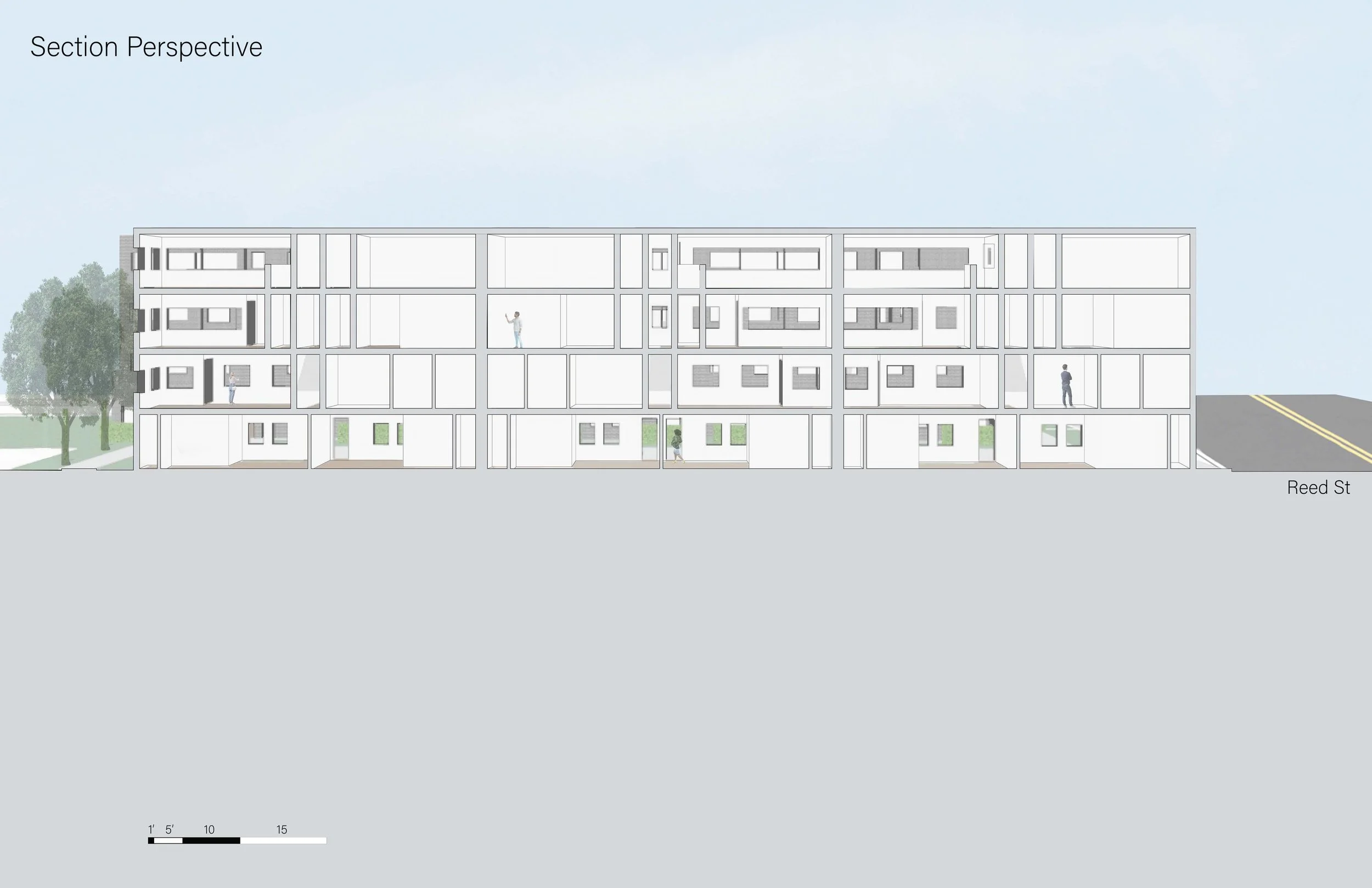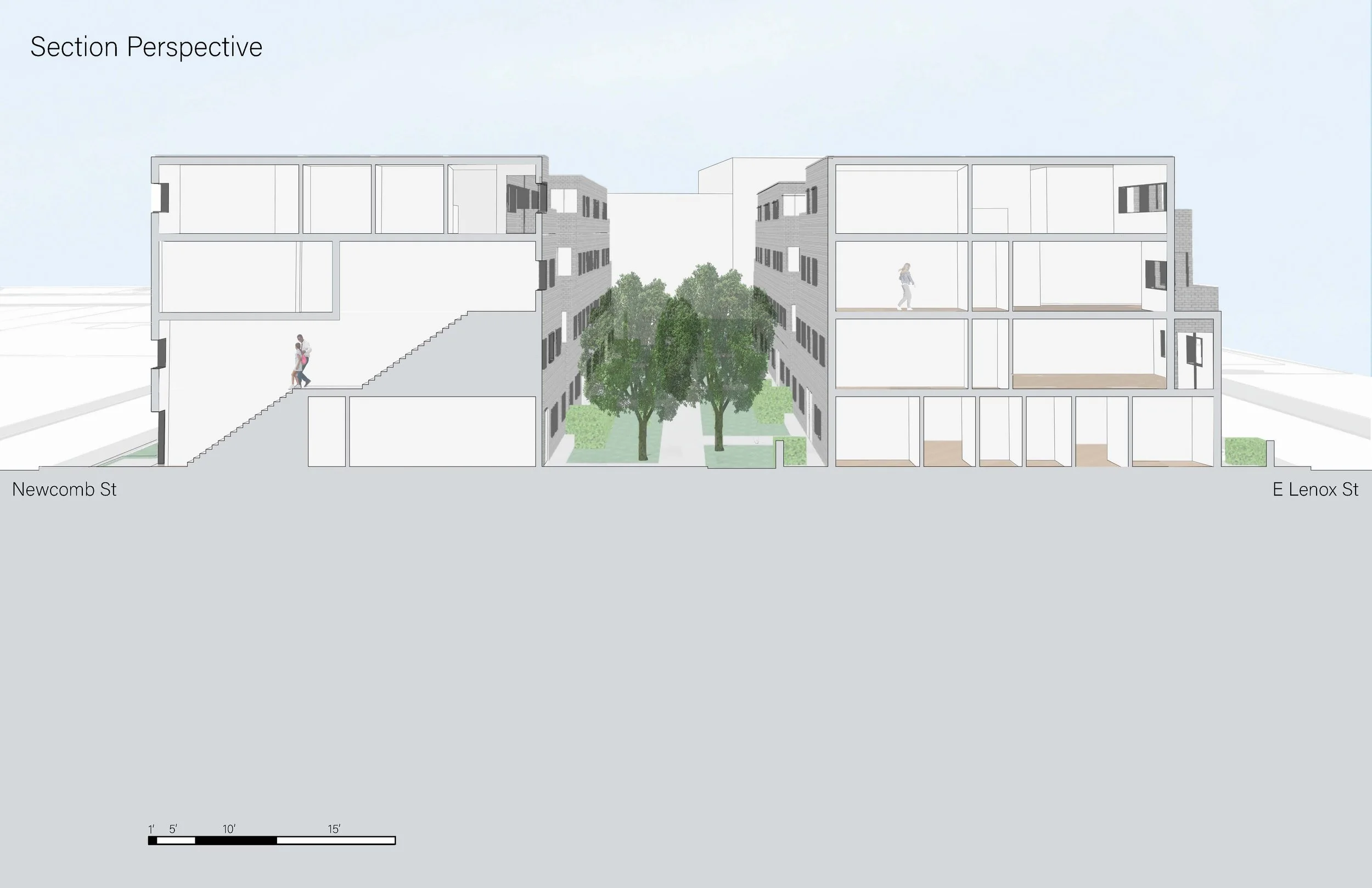 Located in Roxbury, Massachusetts, this project offers a solution to large-scale walk-up urban housing. Keeping within the restraints of Massachusetts fire code, this four-story 58 unit structure accounts for accessibility within ground-floor units and throughout the site. This project, while centered around accessibility and code compliancy, also aims to create an urban space where residents enjoy spending their time, whether it be in their unit or outside with their community.